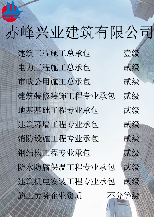 赤峰興業(yè)建筑有限公司簡介 赤峰興業(yè)建筑有限公司成立于1998年7月,位于內(nèi)蒙古赤峰市松山區(qū)。現(xiàn)已發(fā)展成為擁有建筑工程施工總承包壹級、電力工程施工總承包貳級、市政公用工程施工總承包貳級、承裝、修、試四級、?建筑裝修裝飾工程專業(yè)承包貳級、建筑幕墻工程專業(yè)承包貳級、消防設施工程專業(yè)承包貳級、地基基礎工程專業(yè)承包貳級、鋼結構工程專業(yè)承包貳級、建筑機電工程專業(yè)承包二級、防水防腐保溫工程專業(yè)承包貳級以及建筑施工勞務等資質的綜合性建筑施工企...